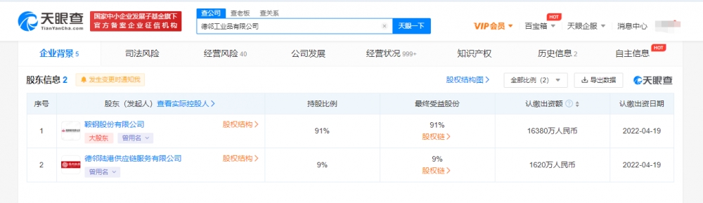 近日,德邻工业品有限公司成立,法定代表人为付志海,注册资本1.8亿人民币,经验范围包括金属材料销售;互联网销售;化工产品销售;区块链技术相关软件和服务等。股东信息显示,该公司由鞍钢股份有限公司、德邻陆港供应链服务有限公司共同持股。