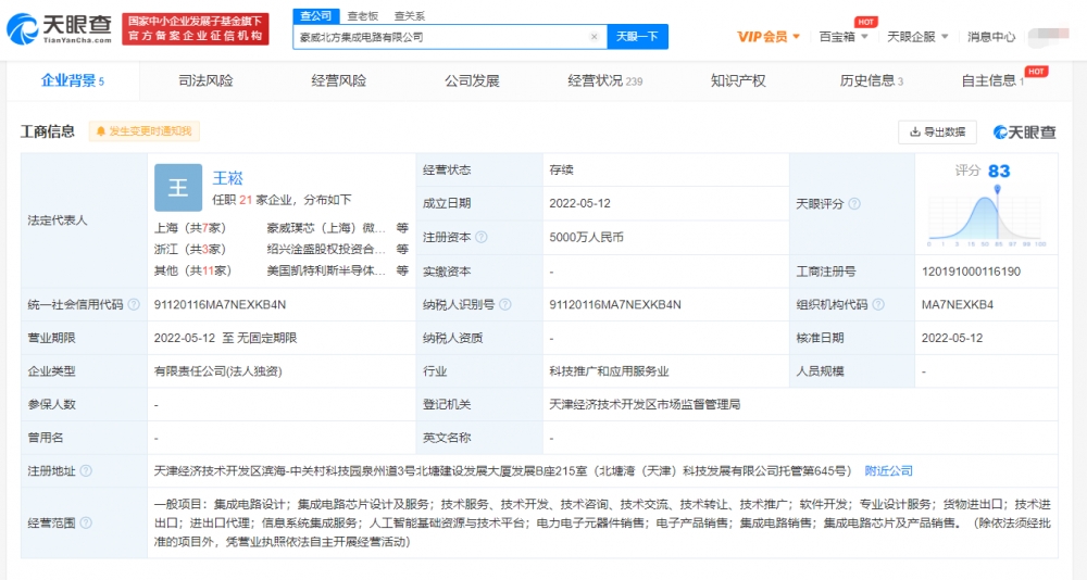近日,豪威北方集成电路有限公司成立,法定代表人王崧,注册资本5000万人民币,经营范围包括人工智能基础资源与技术平台;电力电子元器件销售;电子产品销售;集成电路销售等。股东信息显示,该公司由上海韦尔半导体股份有限公司全资控股。