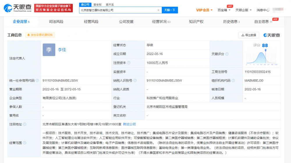 近日,北京数智芯康科技有限公司成立,法定代表人李佳,注册资本1亿人民币,经营范围包括集成电路芯片设计及服务;健康咨询服务;人工智能应用软件开发;可穿戴智能设备销售;第三类医疗器械经营等。股东信息显示,该公司由新希望投资集团有限公司全资持股。