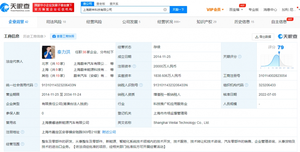 该公司成立于2014年11月,法定代表人秦力洪,经营范围含整车及零部件的研发,汽车零部件的销售等,由NIO NEXTEV LIMITED全资持股。